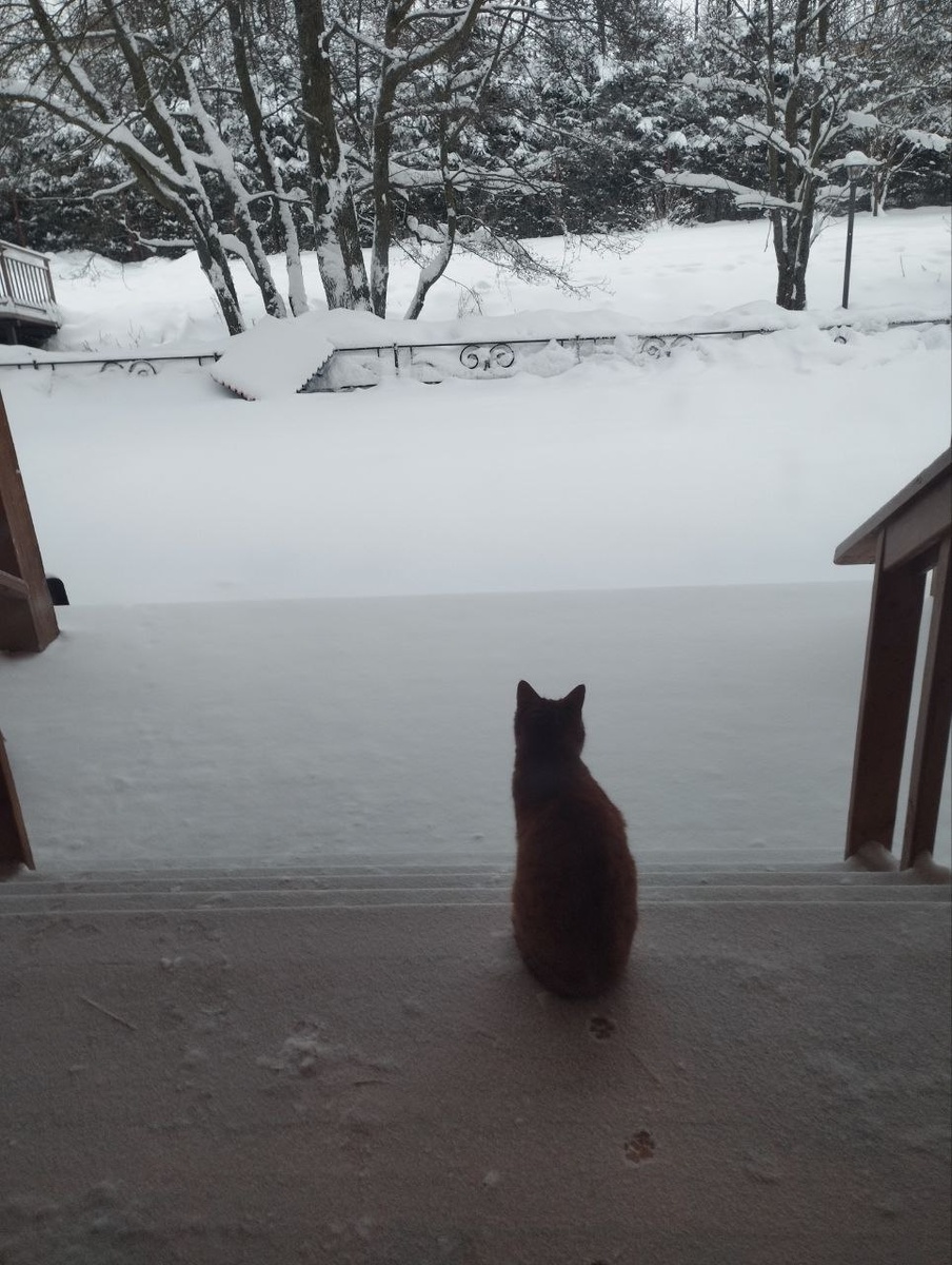 Кошка вышла и зашла обратно, снега слишком много:) Но ничего, я с мальчишками уже всё почистил