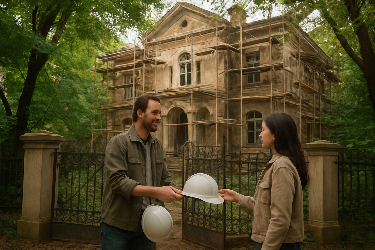 Особняк оказался на тихой улице в центре, спрятанный за кованым забором и разросшимся старым садом. Это была не парадная реставрация «под глянец», а процесс, живой и немного хаотичный. Везде стояли леса, пахло древесной пылью, известкой и старым деревом.