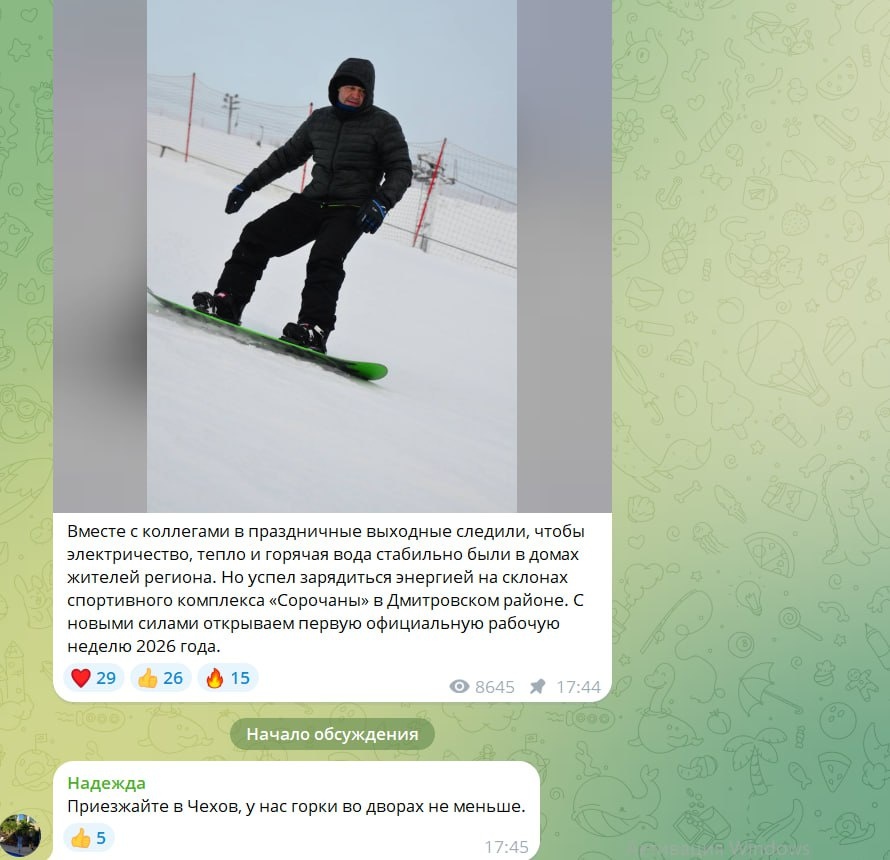 После того, как министр энергетики Московской области Сергей Воропанов поделился в соцсетях фотографией, где он покоряет снежные склоны на сноуборде, жители подмосковных городов наперебой стали приглашать его к себе. По их словам, снега у них не меньше, чем на специально оборудованных трассах, а горки – ничуть не хуже. «Приезжайте в Чехов, у нас горки во дворах не меньше!» «В Лобню милости просим!» «Приезжайте в Химки!»