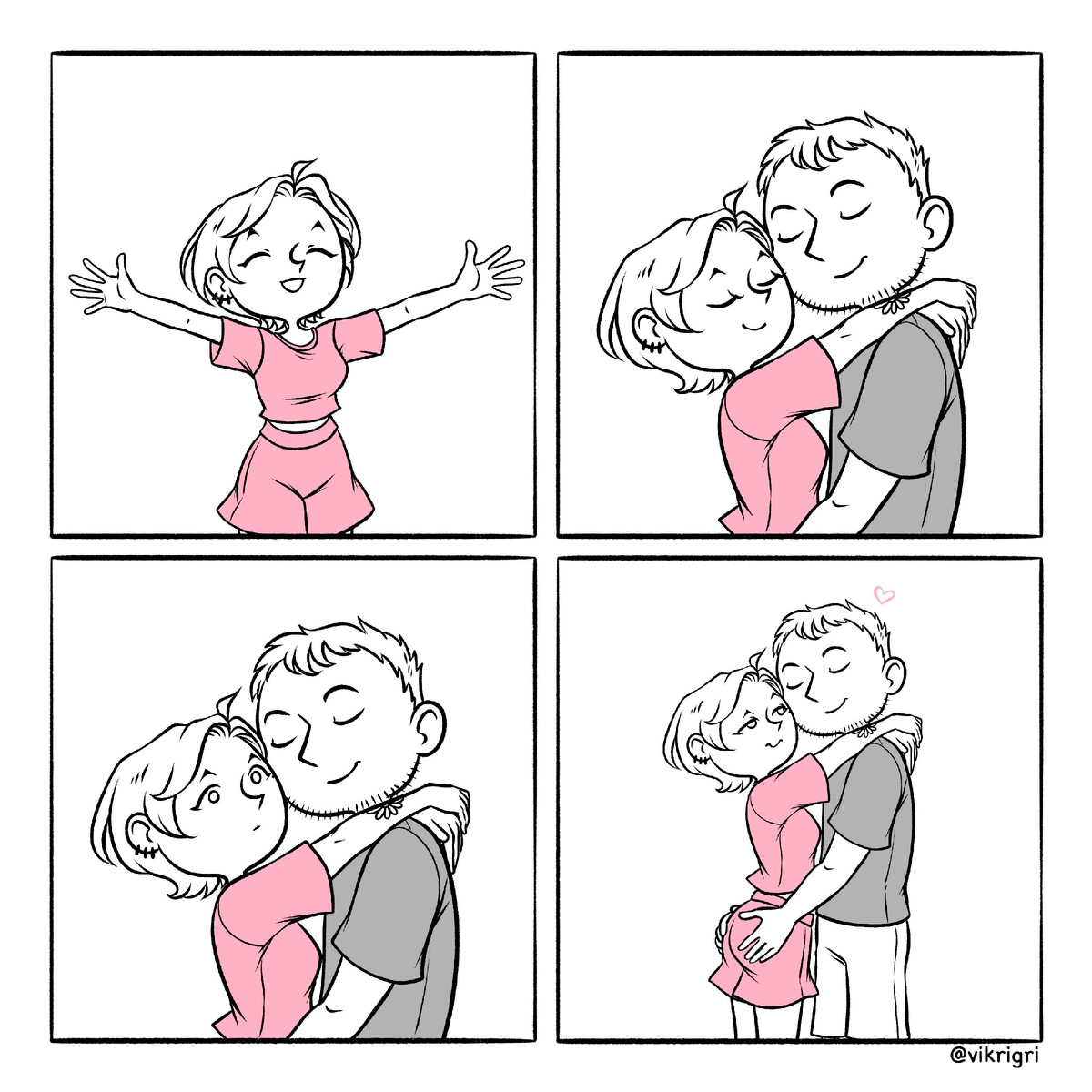 Сам по себе комикс - это очень гибкий формат: он может быть любого размера - от одного кадра до толстенной книжки, вмещать в себя разные жанры - от ужасов до комедии, и затрагивать совершенно разные темы. И если вам кажется, что комикс - это обязательно картинки со словами, то и тут могут быть исключения: некоторые авторы вполне обходятся без слов в своих произведениях и ведут повествование исключительно благодаря изобразительным приемам. Как оказалось - иногда слова и не нужны, особенно когда речь идет о том, что всем знакомо. К примеру, героиня сегодняшней статьи рисует комиксы о семейной жизни и ситуации, которые она иллюстрирует, понятны без слов не только в России, но и для зарубежных читателей. Надеюсь, что эти комиксы понравятся и вам! «Викины закорючки» - это серия юмористических веб-комиксов, созданная московской художницей Викторией Г., также известной под псевдонимом ViKriGri. Проект был запущен в начале 2024 года, с тех пор новые комиксы регулярно появляются в соцсетях Викт