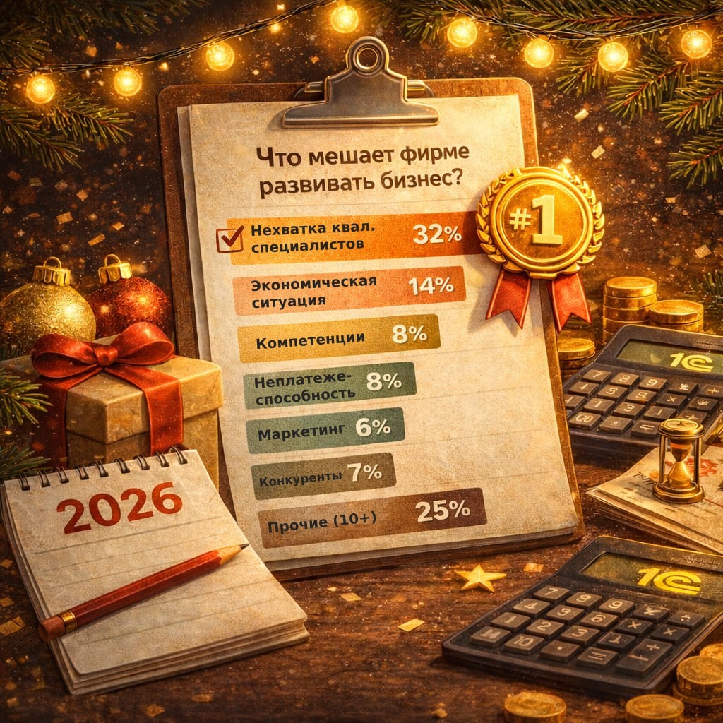 ?.. Спойлер: да, и это уже системная проблема. 🎉 Во-первых, с началом нового рабочего года! Пусть 2026-й станет годом роста, новых навыков и уверенных решений 💪 📊 А вот и немного статистики для размышлений. В конце 2025 года провели опрос среди интеграторов 1С: "Что мешает фирме развивать бизнес?" Вот топ причин: • Нехватка квалифицированных специалистов — 32% • Экономическая ситуация — 14% • Недостаток управленческих компетенций — 8% • Неплатёжеспособность клиентов — 8% • Конкуренция — 7% • Слабый маркетинг — 6% • Прочие (10+ причин) — 25% 📊 трудности с кадрами — треть всех ответов. 📌 Вывод простой: кто вкладывается в развитие специалистов — тот выигрывает. А для самих специалистов 1С это сигнал: ваши навыки в 2026 году будут нужны ещё больше 😉
