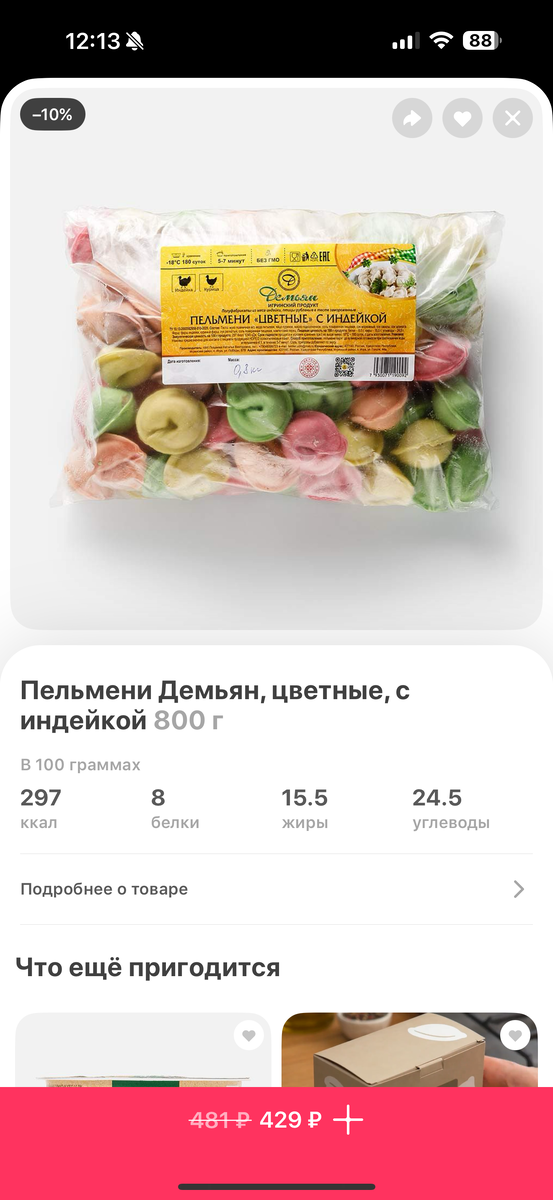 Знакомо чувство, когда хочется пообедать быстро, но не полуфабрикатом-загадкой? Я со своим режимом, нахожусь в этой борьбе постоянно. Надоели стандартные пельмени, а на лепку домашних никогда нет времени. И вот, в «Самокате» мое внимание приковала упаковка с радужными пельменями с индейкой (скрин ниже). Первые мысли, конечно, были о том, что красивое не равно полезное. Скепсис боролся с интересом. Но натуральный состав переманил меня на свою сторону. Решила попробовать. И вот что из этого вышло.