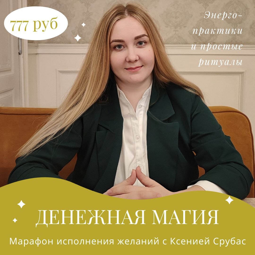 приходит ко мне. Поэтому я решила создать марафон ДЕНЕЖНАЯ МАГИЯ,🌜 Магия денег 💲– это разновидность белой магии, которая призвана не только уменьшить влияние негативных факторов, но и увеличить положительные, которые влияют на все операции, проводимые с деньгами🙌 Деньги — это энергия, которая открывает перед вами возможности💸. И чем больше энергии, тем больше возможностей. Они могут наполнять вас энергией, а могут отнимать последние силы. Выбор за вами. А как вы относитесь к деньгам? Поразмыслите ― не кроется ли в вашем к ним отношении причина всех финансовых неудач? А лучше приходите на ДЕНЕЖНУЮ МАГИЮ и узнайте истинные причины ваших проблем финансами☹️ На марафон я собрала для вас лучшие практики, ритуалы, артефакты и диагностики. 💸Энергопрактика на избавление от страхов и блоков связанных с деньгами 💸Денежные энергопрактики на привлечение финансов 💸Свечной ритуал на раскрытие дорог 💸Денежный алтарь для дома или офиса 💸Диагностика финансовой сферы на таро с Ксенией Сру