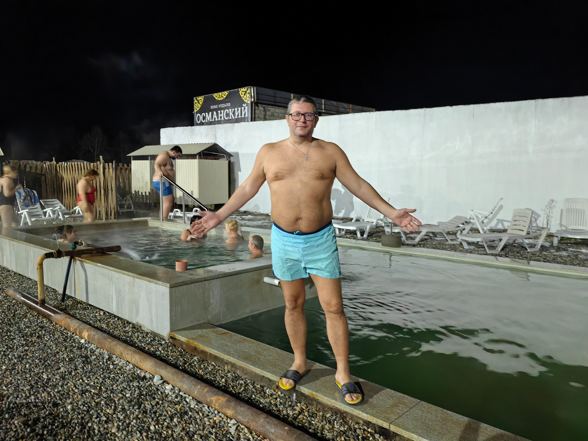 А мы и в Кабардино-Балкарии отметились водными процедурами. Благо и здесь есть термы. В этот раз мы не выбирали сами куда ехать, нас в Аушигер привез экскурсовод, вот ему мы и доверились. Термальный комплекс «Османский двор», где мы провели время, постепенно обустраивается. Да, пока тут нет полноценных раздевалок с ключиками, но кто хочет искать минусы, пусть этим занимается, наша история не про это, тем более у нас был всего час на купание. Когда после ВОВ здесь начали искать нефть, то геологи везде бурили глубокие скважины. Но вместо нефти из скважин стала бить горячая минеральная вода. Глубина скважин якобы 4 км, температура воды почти 60 градусов! Так и появились Аушигерские термальные источники. Сейчас здесь оборудовано несколько бассейнов с горячей водой. Воду, конечно, охлаждают примерно до 35-39 градусов. Минеральная вода термальных источников Аушегера обладает целебными свойствами. Она помогает при заболеваниях суставов, заболеваниях кожи и нервных расстройствах. Кстати, вода