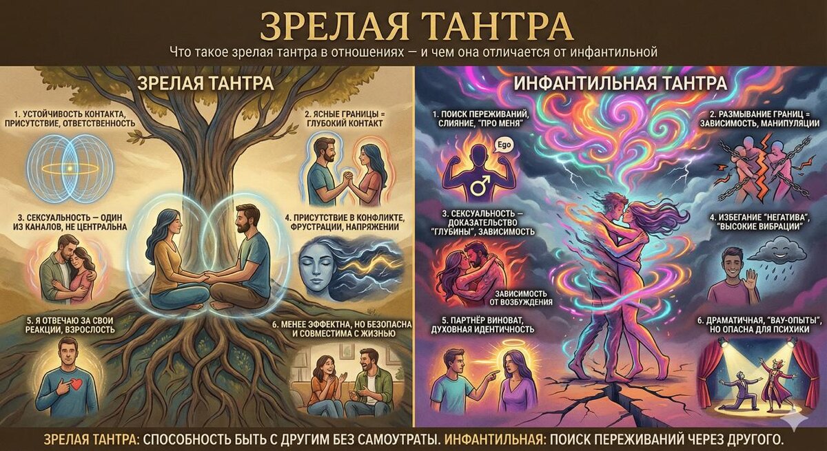 Начну с жёсткого, но точного тезиса: зрелая тантра в отношениях начинается там, где заканчивается поиск переживаний. Инфантильная — наоборот: она почти полностью на них построена. Инфантильная тантра направлена на: – усиление чувств, – переживание «особой близости», – растворение границ, – ощущение слияния, – подтверждение собственной значимости. Это почти всегда история про меня: «что я чувствую», «насколько со мной это происходит», «как я раскрываюсь». Зрелая тантра направлена на: – устойчивость контакта, – способность выдерживать другого как другого, – сохранение ясности при интенсивности, – ответственность за влияние. Это история не про слияние, а про присутствие. Инфантильная тантра романтизирует размывание границ: – «мы одно», – «границы — иллюзия», – «контроль мешает любви». На практике это почти всегда ведёт к: – зависимостям, – ревности, – манипуляциям, – эмоциональной неустойчивости. Зрелая тантра делает противоположное: она усиливает границы, а не стирает их. Парадокс, котор