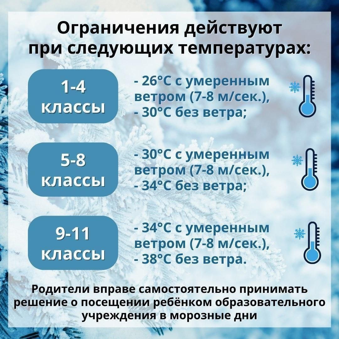 : ❄️ 1-4 классы - 26°С с умеренным ветром (7-8 м/сек.), - 30°С без ветра; ❄️ 5-8 классы - 30°С с умеренным ветром (7-8 м/сек.), - 34°С без ветра; ❄️ 9-11 классы - 34°С с умеренным ветром (7-8 м/сек.), - 38°С без ветра. ❗Родители вправе самостоятельно принимать решение о посещении ребёнком образовательной организации в морозные дни.