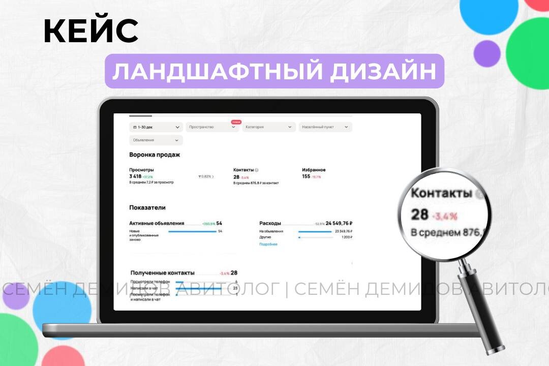 Узкая B2B-ниша, девелоперы, сделки на этапе подписания Сегодня делюсь кейсом из очень узкого направления, которое многие считают «нерабочим» для Авито — проектирование благоустройства территорий жилых комплексов и ландшафтный дизайн для девелоперов. Клиент принципиально не работает с частными домами и не берет мелкие заказы. Минимальный масштаб — от 1 гектара. 📊 Результат за первый месяц • Бюджет: 24 550 ₽ • Контакты: 28 • Стоимость контакта: 876 ₽ Для такой B2B-ниши это нормальная и рабочая цифра, потому что 1 контракт окупает рекламу на месяцы вперёд. 🚩 С чем пришёл клиент До старта клиент был уверен, что: ❌ на Авито нет целевой аудитории, ❌ приходят только собственники частных домов, ❌ заявки — нецелевые и бесполезные. И, по сути, он был прав — до правильной настройки. 🔧 Что было сделано 1️⃣ Жёсткое сегментирование аудитории Первое и главное — отсечение частников. В текстах и заголовках чётко указали: • работаем только с девелоперами, • не берем загородную недвижимость, • минимал