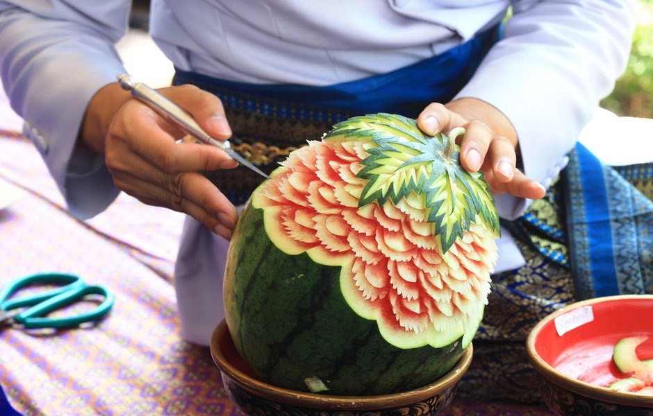 Рассказываем о настоящем кулинарном искусстве, которое при всей своей кропотливости придает блюдам вид настоящих шедевров. Научиться вырезать из продуктов можно и дома. Сегодня в рубрике "Азбука кулинара", в рамках которой мы рассказываем о непонятных словах, употребляемых шефами, еще один термин – карвинг. Карвинг в переводе с английского означает "вырезание". А если точнее, это художественное вырезание из фруктов, овощей или шоколада, которое применяется для украшения блюд и придания им праздничного вида. Его истоки лежат в восточной традиции делать красивой и замысловатой любую, даже будничную еду. Искусство карвинга — одно из сложнейших в кулинарной практике, но начав с простых шагов, ему можно научиться самостоятельно. С чего начать Вырезать можно практически из любых овощей, фруктов или шоколада. Классические продукты для карвинга — арбузы, дыни, тыквы, яблоки, апельсины, редис, огурцы, картофель. Но нужно учитывать, что некоторые фрукты и овощи при резке могут потемнеть, поэтом