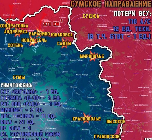 В группировка войск «Север» ВС РФ, которая создает полосы безопасности в Харьковской и Сумской областях, сдерживая ВСУ у границ Курской области, рассказали об изменении текущей боевой обстановки на линии фронта в приграничье. 11 января на Сумском направлении Северяне увеличили количество участков наступления. Авиация ВКС РФ интенсивно работала по выявленным целям ВСУ. Отмечено продвижение Армии России в Сумской области на 17 участках: в Сумском районе — на 14 и в Краснопольском — на трех. Противник продолжал укреплять оборону и пытался восстанавливать боеспособность штурмовых групп для проведения контратак. Командование ВСУ для оборудования новых укреплений из-за нехватки личного состава в инженерных полках задействует пехоту и штурмовиков. За сутки потери противника составили свыше 110 человек. В Сумской области российскими военными ликвидированы САУ «Богдана», две гаубицы Д-30 и два миномета, РЛС ОВЦ «Рада», десять внедорожников и багги, четыре пункта управления БПЛА, две станции спу