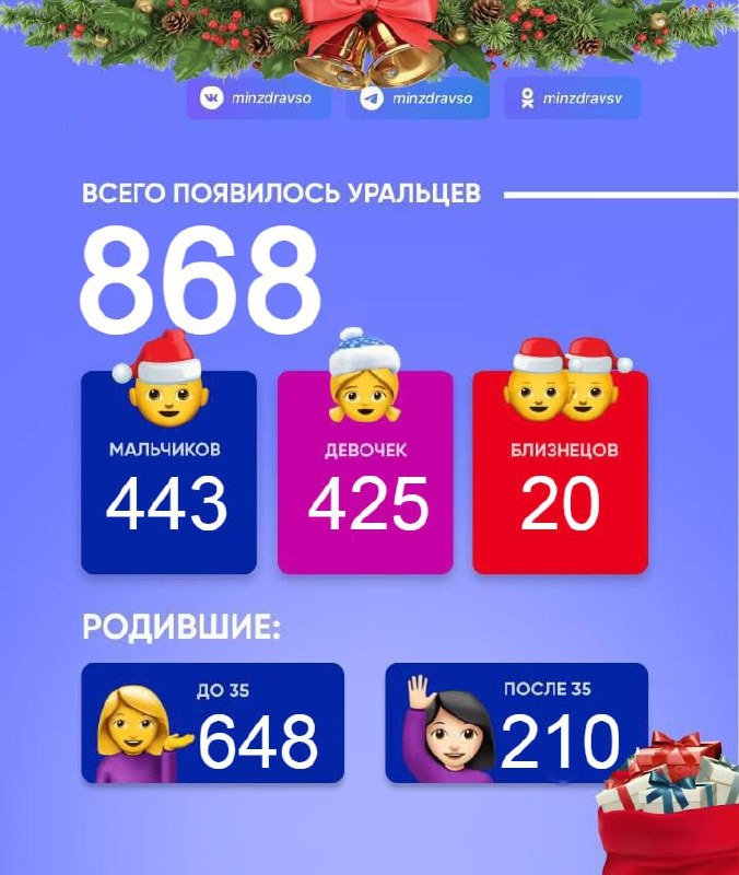 : 443 мальчика и 425 девочек, из них 10 пар близнецов! 648 мам родили до 35 лет. 210 мамочек родили после 35 лет. Для восьми мамочек это стали седьмые по счету роды. 139 новорожденных стали третьими детьми у своих мам, а 254 малыша — вторыми, сообщает тг-канал «Здоровье уральцев». Мы в МАХ