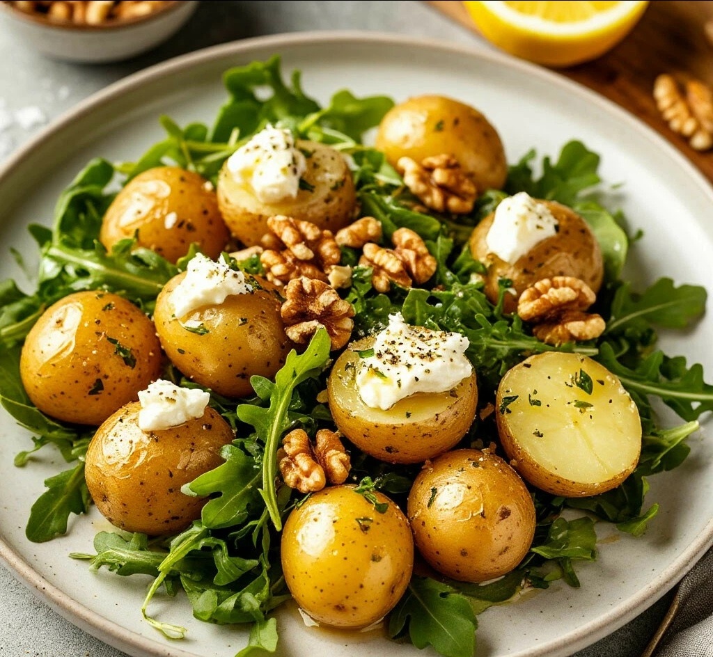 ИНГРЕДИЕНТЫ: 🧾 ·Молодой картофель — 500 г ·Сыр козий (в рассоле или мягкий) — 100 g ·Руккола — 70 г 🥬 ·Грецкие орехи — 50 g ·Мёд — 1 ст.л. 🍯 ·Горчица дижонская — 1 ч.л. ·Сок 1/2 лимона 🍋 ·Оливковое масло extra virgin — 3 ст.л. ·Соль, перец — по вкусу