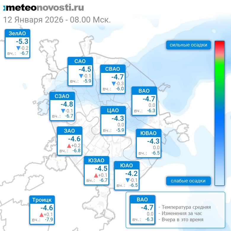 В 8:00 в Москве было от -5.6°C до -3.1°C, средняя температура -4.5°C #погода #Москва #зима #температура #12января #понедельник