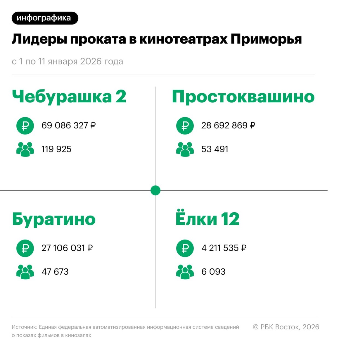 🔹Первое место по кассовым сборам в регионе занял фильм «Чебурашка 2». С 1 по 11 января картина собрала 69,1 млн руб., привлекла 119,9 тыс. зрителей и была показана 1 433 раза. Средняя выручка одного сеанса превысила 48 тыс. руб., среднее количество зрителей на сеансе — 84. 🔹Вторую строчку занял фильм «Простоквашино» со сборами 28,7 млн руб. и аудиторией 53,5 тыс. зрителей. Количество сеансов составило 951, средняя выручка одного показа — около 30 тыс. руб., среднее количество зрителей на сеансе — 56. 🔹Третьим по сборам стал фильм «Буратино», который собрал 27,1 млн руб. при 47,7 тыс. зрителей и 976 сеансах. Средняя выручка одного сеанса составила 27,8 тыс. руб., среднее количество зрителей на сеансе — 49. Также в первую десятку вошли «Елки 12», «Три богатыря и свет клином», «Букет», «Пункт назначения. Новый аттракцион», «Горничная» и «Иллюзия обмана 3» и «Три кота. Путешествие во времени». 😃 РБК Восток в Telegram и MAX
