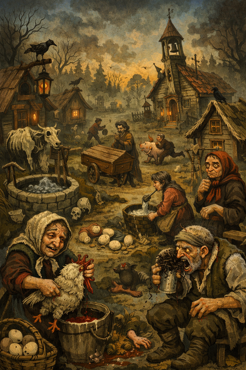 В деревне тем временем происходило нормальное. То есть ненормальное даже по местным меркам. У Фёдора изо рта полезла земля, когда он попытался выпить. Пелагея обнаружила, что её тень молится отдельно. А у колодца стояла корова, которой не было уже неделю, и мычала — беззвучно.