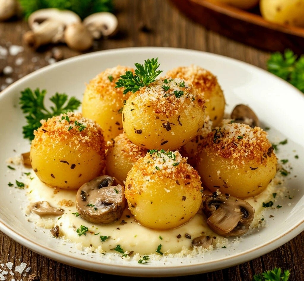 ИНГРЕДИЕНТЫ: 🧾 ·Картофель — 500 г (для пюре) ·Грибы (шампиньоны/вешенки) — 200 г 🍄 ·Лук репчатый — 1 шт. 🧅 ·Сливки 10% — 50 мл ·Тёртый пармезан — 40 г ·Панировочные сухари — 80 г ·Масло растительное для фритюра ·Соль, перец, мускатный орех — по вкусу Для соуса: ·Сметана 20% — 100 г ·Трюфельное масло — 1/2 ч.л. (или больше по вкусу) ·Соль, свежая зелень (петрушка/укроп)
