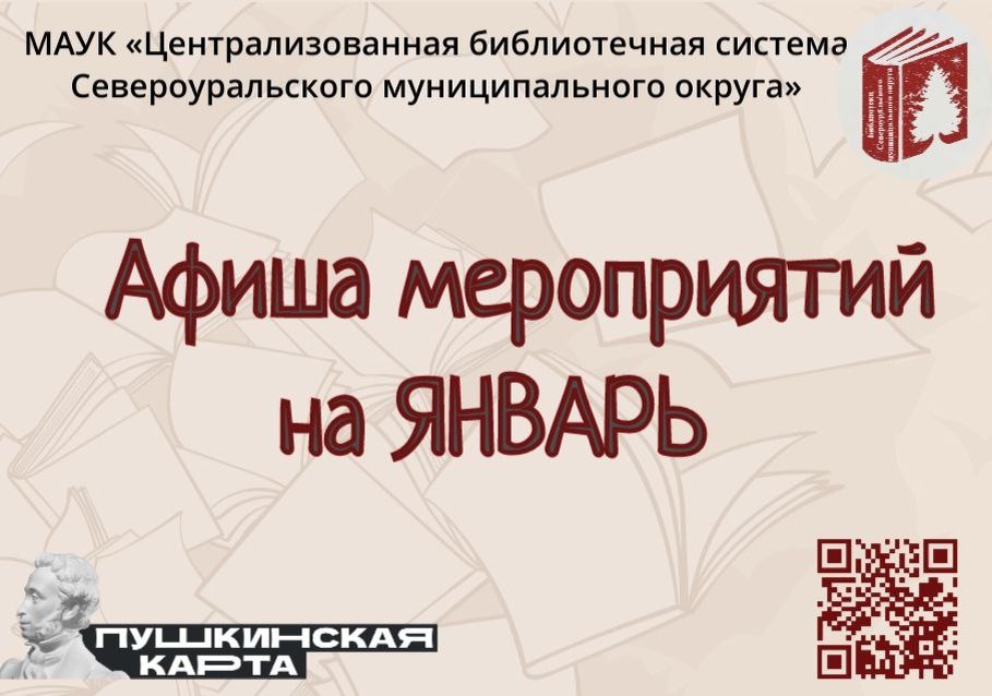А. Н. Арцибашева г. Североуральск ул. Мира, 11 ✅13 января в 14:00 ч. Пешая экскурсия «Маршруты боевой славы» ✅15 января в 14:00 ч. Краеведческая экскурсия «Петропавловская старина» ✅По вторникам в 10. 00 ч. "Игровой альянс" ✅По средам в 14. 00 ч. Лекторий «Нескучная классика» 📕Библиотека для детей и молодежи г. Североуральск ул. Октябрьская, 29 ✅28 января в 14:00 ч. Экскурсия «Город и СУБР. История длиною в век» 📕Библиотека п. Черемухово ул. Калинина, 5 ✅30 января 15:00 ч. Квест «Сквозь волшебный портал» 📕Библиотека семейного чтения п. Калья ул. Ленина, 33 ✅По субботам в 15:00 ч. Интеллектуальная игра «Три К» (КиноКнигоКвиз) 📕Библиотека с. Всеволодо-Благодатское ул. Кирова, 21 ✅По четвергам в 10.00 ч. Краеведческое посвящение селу «Благодать-то какая!» Подробная информация о мероприятиях: svurcbs.ru/item/1653403 svurcbs.ru/item/2363648 МАУК "Централизованная библиотечная система СМО" #январь #афиша