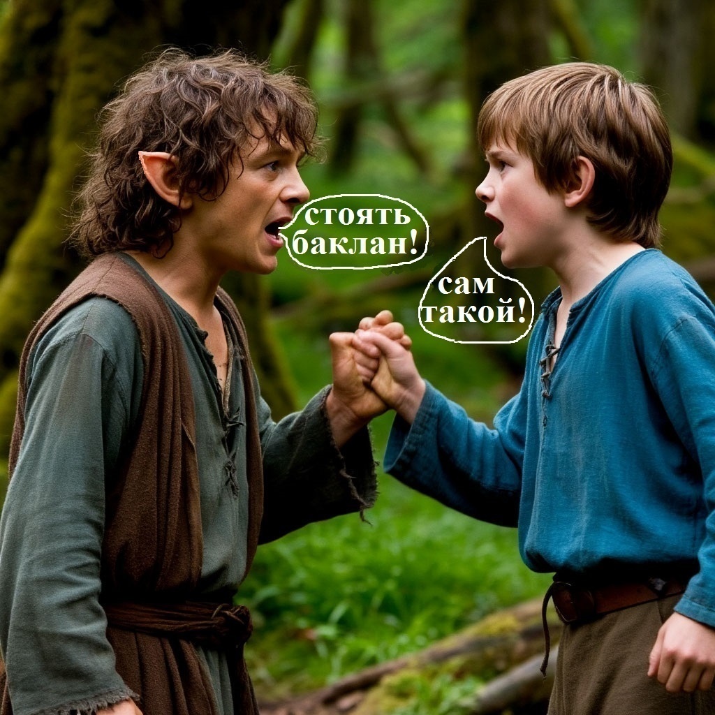 Стал новый спутник сразу петушиться, Хотел наверно самоутвердиться: — Стоять, боятся, прёшь куда, бак лан?! — Ну в общем действовал как хулиган. * Не дрогнул Алексей, себя вёл смело, Но вежливо, хотя внутри кипело: —Ты слишком много не воображай, Оставь замашки и не наезжай. * А тот: —Да я же самый главный хоббит! Меч: —У слона бывает только хобот. Ты перед ним – клоп, ши бз дик, а не туз. * —Кто выдал кличку? — пискнул карапуз. —Я вообще-то скоро стану взрослый И не смотри, что щуплый, низкорослый. Невеста есть, уж год как полюбил, Но правда … ей ещё не говорил. Эльф: —Фродо Бэггинс, хватит балаболить. Веди друзей. Пора вам троллей трол лить. Ты выучил, опасны чем они? Попутно Лёше это объясни. Скривился хоббит: —А чего трепаться? Практически не стоит их бояться: Лохматые, огромные носы, В обличье человеческом – хвосты * Мгновенно выдадут, размер меняют, Козлов, псов чёрных облик принимают, Но всё равно несложно убежать, А также хвост возможно оторвать. Ведь без хвостов они теряют сил