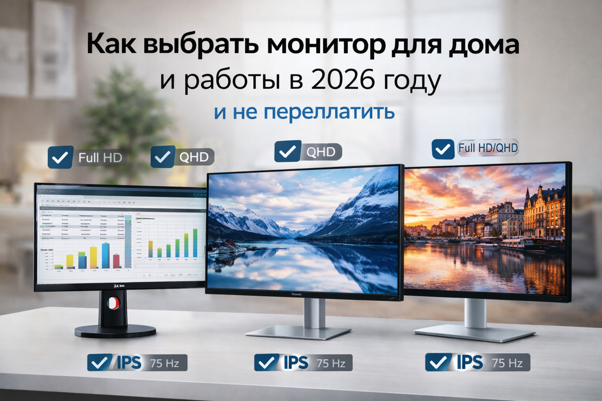 Монитор — это устройство, с которым многие проводят по 6–10 часов в день. При этом чаще всего его выбирают «по диагонали и цене», а потом сталкиваются с усталостью глаз, неудобным масштабом или размытым текстом. Разберёмся, на какие параметры действительно стоит обращать внимание, если монитор нужен для дома, удалённой работы, учёбы или повседневных задач — без переплаты за маркетинг. Самая частая ошибка — брать большой монитор с низким разрешением. Оптимальные варианты: ⚠️ 27" с Full HD — почти всегда разочарование: крупные пиксели, устают глаза. Если коротко: Для работы с текстом, таблицами, видео и обычного использования IPS — оптимум. Даже если вы не играете: Прокрутка страниц и движение курсора на 75–100 Гц ощущаются мягче, чем на старых 60 Гц. Ищите в характеристиках: Это особенно важно, если вы работаете вечером или в помещении с искусственным освещением. Даже хороший монитор может быть неудобным. Желательно: Если подставка простая — VESA спасает. Минимум для комфорта: Если ноу