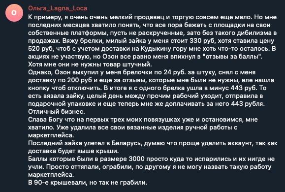 Поймал себя на мысли, что в этой истории я даже не защищаю «продавца зайки». Не потому что жалко маркетплейс, а потому что правда сложнее. Во многом она сама виновата — ввязалась в игру, которая изначально была не по зубам. Маркетплейсы давно перестали быть историей «выложил товар — само продалось». Это сложная система с логистикой, акциями, баллами, алгоритмами, скрытыми списаниями и правилами, которые нужно читать как договор с банком. Ручная работа, штучный товар, отсутствие расчёта юнит-экономики и вера в «честную площадку» — это плохая комбинация. Итог почти всегда одинаковый: минус, обида и ощущение, что тебя ограбили. Здесь нет злодея в чистом виде. Есть маркетплейс, заточенный под оборот и масштаб. И есть микроселлер, который зашёл туда как на ярмарку. Проблема в том, что ярмарка давно закрылась, а вывеску забыли снять. К примеру, я очень очень мелкий продавец и торгую совсем еще мало. Но мне последних месяцев хватило понять, что все пора бежать с площадки на свои собствен