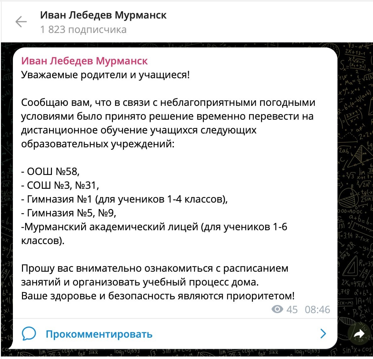 А в Мурманске мэр сумятицу вводит, информируя о переводе на дистанционное обучение учеников некоторых школ