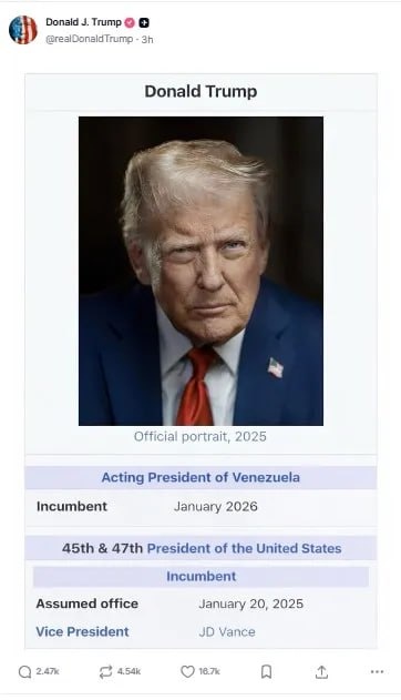 Трамп назвал себя президентом Венесуэлы Скриншот страницы англоязычной «Википедии» с такой записью он опубликовал в соцсети Truth Social вечером, 11 января. Там Дональд Трамп подписан как Acting President of Venezuela. В переводе на русский язык – «исполняющий обязанности президента». В качестве даты «вступления в должность» на скриншоте указан январь 2026 года. Была ли на самом деле такая правка в электронной энциклопедии или нет, не до конца понятно. Но, во всяком случае, спустя три часа после публикации в «Википедии» Трамп указан только как 45 и 47 президент США. Фото: truthsocial/realDonaldTrump t.me/CMN_KZ