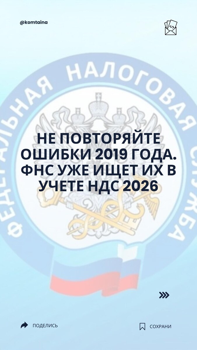 ФНС уже ищет их в учете НДС 2026 Повышение НДС до 22 процентов уже было. В 2019 году бизнес прошел через это и заплатил за спешку, невнимательность и неверные решения. Теперь ситуация повторяется. ФНС подняла статистику НДС-ошибок 2019 года. Результат показательный. Эти же нарушения инспекторы ждут сейчас, в переходе на ставку 22 процента. И к ним уже готовы применять штрафы. Если проверить учет в январе, риски еще можно снять. В этом посте - ТОП-4 самых опасных ошибок, которые ФНС считает приоритетными. Ошибки расположены по нарастанию риска. Самая массовая и дорогая - в конце. 👉 @ProffLinkBot - всегда готовы вам помочь в вопросах НДС. @komtaina