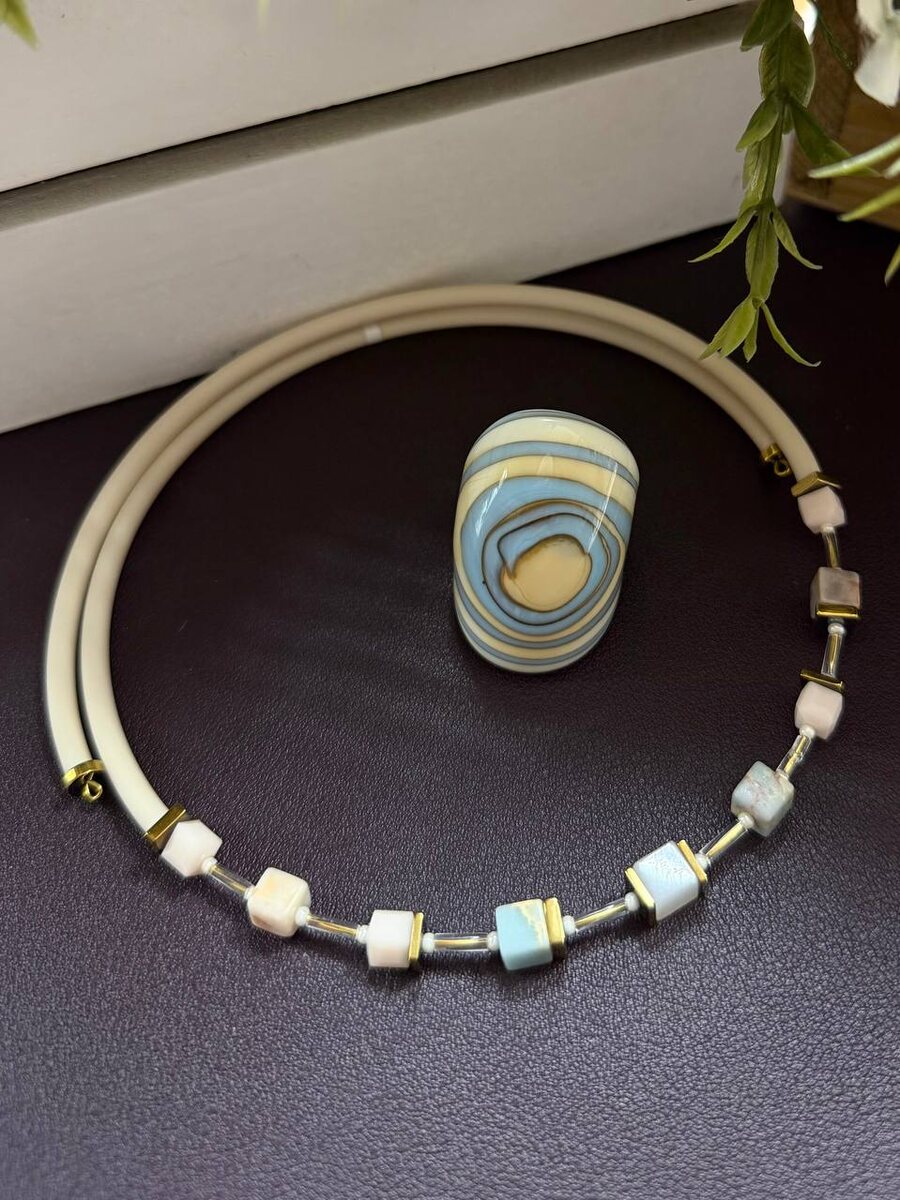 ☺️ Этот комплект — для тех, кто любит оттенки, но не готов к ярким цветам. Молочный, мягкий голубой, спокойные переливы — они работают деликатно, не спорят с одеждой и не требуют сложной стилизации: надели — и всё уже выглядит продуманно. Колье с геометричными бусинами держит форму и красиво ложится по линии шеи. Кольцо с плавным рисунком добавляет глубину и делает образ интересным, даже если на вас базовая рубашка, серый жакет или простой трикотаж. Колье 3300-15%=2.805 Кольцо 3600-15%=3.060 ✨Нажмите для заказа ✉️ Нажмите чтобы задать вопрос