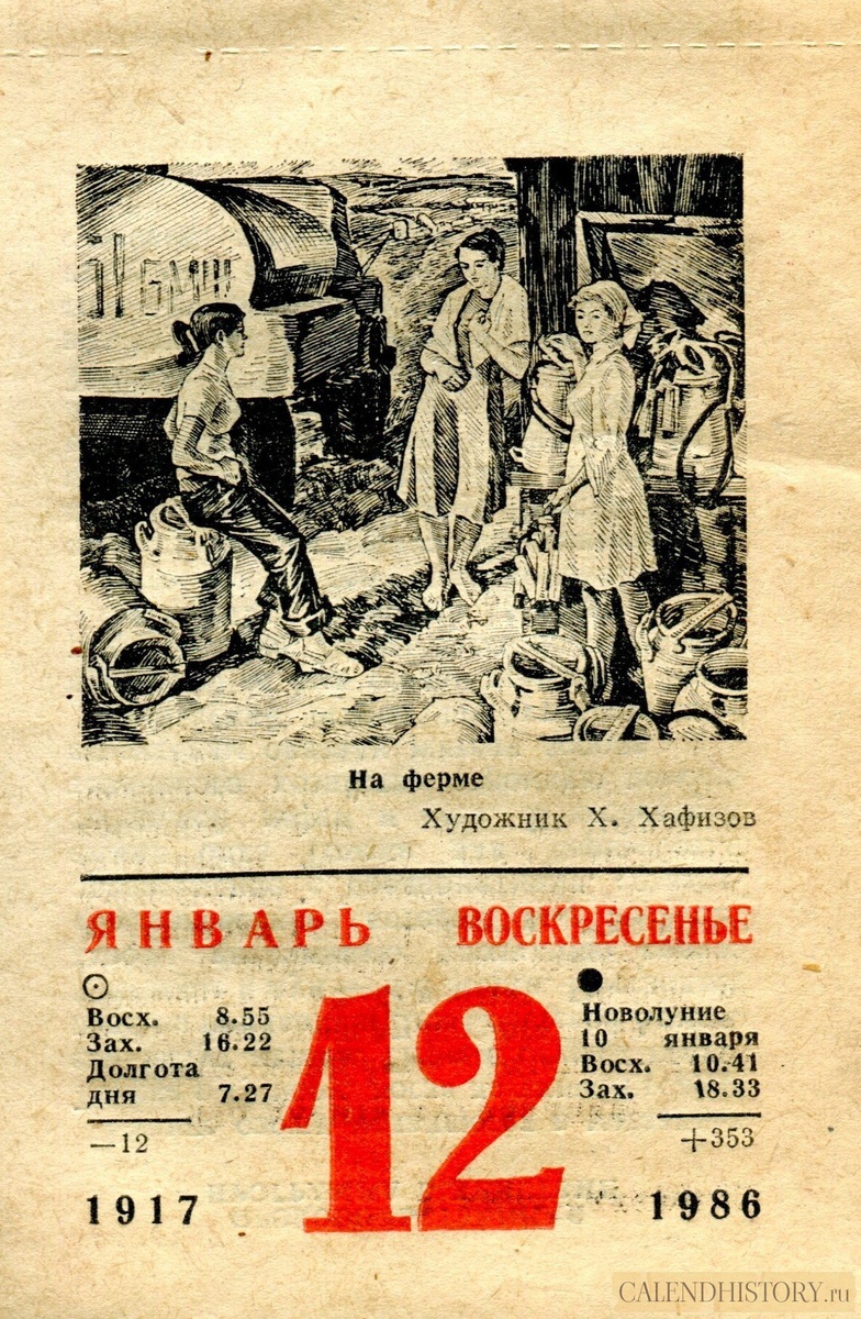 12 января 1986-го года — Календарь для женщин На ферме Художник X. Хафизов Больше старых советских отрывных календарей смотрите у нас на сайте - calendhistory.ru https://calendhistory.ru/12-janvarja-1986-go-goda-kalendar-dlja-zhenshhin/