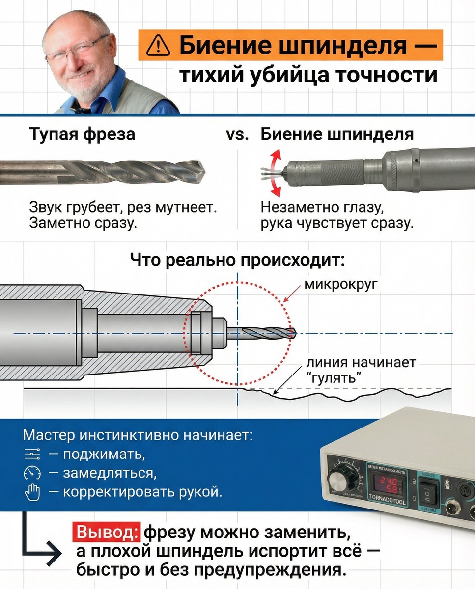 Тупая фреза выдаёт себя сразу. Звук грубеет, рез мутнеет, рука понимает: пора менять. Биение шпинделя работает иначе. Оно незаметно глазу, но рука чувствует его с первых секунд. Что реально происходит: 🔸 бор вращается не по оси, а по микрокругу; 🔸 каждая точка реза получается чуть смещённой; 🔸 линия начинает «гулять», даже если ты ведёшь идеально. Мастер инстинктивно начинает: — поджимать, — замедляться, — корректировать рукой. И вот тут точность умирает окончательно. Потому что работа превращается в компенсацию дефекта. Вывод простой: фрезу можно заменить за минуту, а плохой шпиндель испортит всё — быстро и без предупреждения.