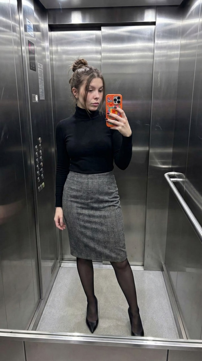 🔠🔠🔠🔠🔠🔠🔠 💼 Серия снимков "Офис" 1 из 3 👉Генерирую тут Use the uploaded photo to reference your face and appearance. Keeping the facial features and not changing. Keep 100% similarity. A realistic mirror selfie shot taken in a modern elevator with metallic walls. The woman is wearing a fitted black turtleneck tucked into a grey plaid wool pencil skirt. She wears sheer black tights and pointed-toe stilettos. Her hair is styled in a messy bun with face-framing strands. She is holding the orange iPhone 17 pro showing a cute phone case. Reflection shows the elevator buttons and metallic textures. Flash photography style, high contrast, 90s minimalism, fashion blog aesthetic, incredibly detailed, 8k resolution. --ar 9:16 Заказать промт или фотосессию. ✉️ Буст канала. ⚡️ Тут креаторы ПОДАТЬ ЗАЯВКУ #нейросеть #aiфотосессия #промтыдляфотографа #женскийпромт