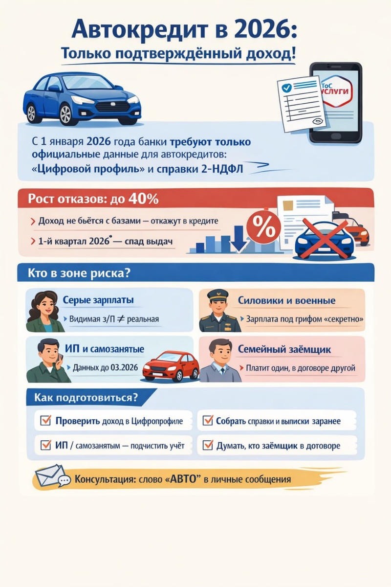 С 1 января 2026 банки по автокредитам не могут: 1️⃣верить доходу “из анкеты” 2️⃣и считать платежеспособность по своим “внутренним моделям” ‼️Теперь для решения нужен только подтверждённый доход: через «Цифровой профиль» на Госуслугах и/или официальные документы типа 2-НДФЛ. Почему будет больше отказов По оценкам рынка, до 40% потенциальных заёмщиков могут “выпасть” просто потому, что доход не бьётся с официальными базами. 🔹Плюс начало 2026 — это адаптация, и банки уже говорят о возможной просадке выдач в первые месяцы. Кто в зоне риска (и почему) ✅“Серые” зарплаты — реальный доход есть, а в официальных данных его как будто не было. ✅Силовики/военные — доходы часто закрытые, справки и подтверждение могут быть квестом. ✅ИП / самозанятые / УСН — часть данных для кредиторов обещана к марту 2026, до этого у многих будет “пустое место” вместо подтверждения. ✅“Семейная покупка” — когда оформляет один, а платит другой: банку нужно видеть доход того, кто в договоре, а не “в целом по