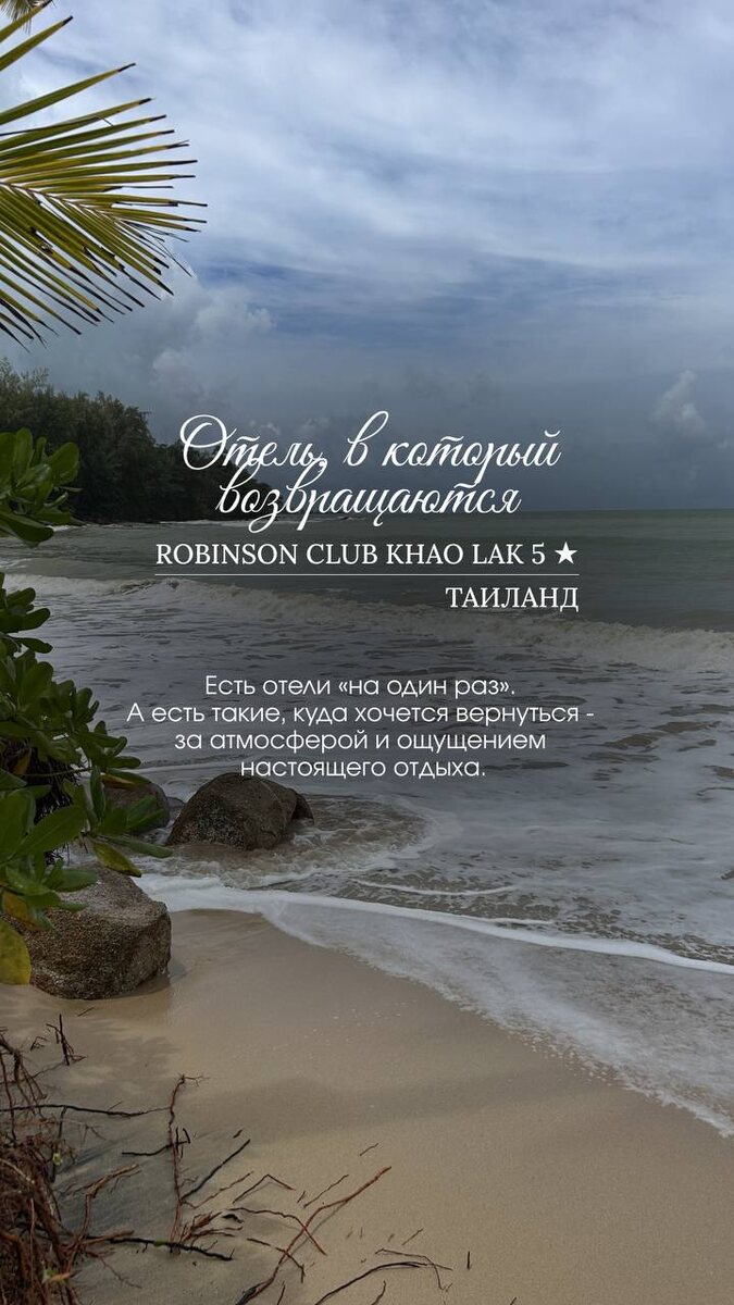 🏨Отель, в который возвращаются - и это многое говорит. Таиланд, Пхукет. Есть отели, куда приезжают «поставить галочку». А есть такие, куда хочется вернуться - за атмосферой, ощущением простоты и полноценного отдыха. Robinson Club Khao Lak - как раз из этой категории. Большая зелёная территория, берег моря, красивый и очень фотогеничный пляж, вечера с живой атмосферой. ✅ Расположение Пляж Паквиб, первая линия. 83 км от аэропорта Пхукета. Песчаный пляж прямо у отеля. Пляжные полотенца, зонтики и шезлонги - бесплатно. ✅ Территория Огромная - 280 000 кв.м. Отель состоит из: ▪️ 12 трёхэтажных корпусов ▪️ 85 одноэтажных бунгало ▪️ 12 вилл (1–3 этажа) Просторно, зелено, красиво - много воздуха и ощущение курорта, а не «муравейника». ✅ Уровень и атмосфера Клубный формат Robinson: — активный, но не шумный — живой, но комфортный Каждый вечер - выступления, шоу, живая музыка. Две сцены, легкая вечерняя жизнь. ✅ Питание Можно выбрать удобный формат: ▪️ BB — завтрак ▪️ HB — завтрак + ужин (шведск
