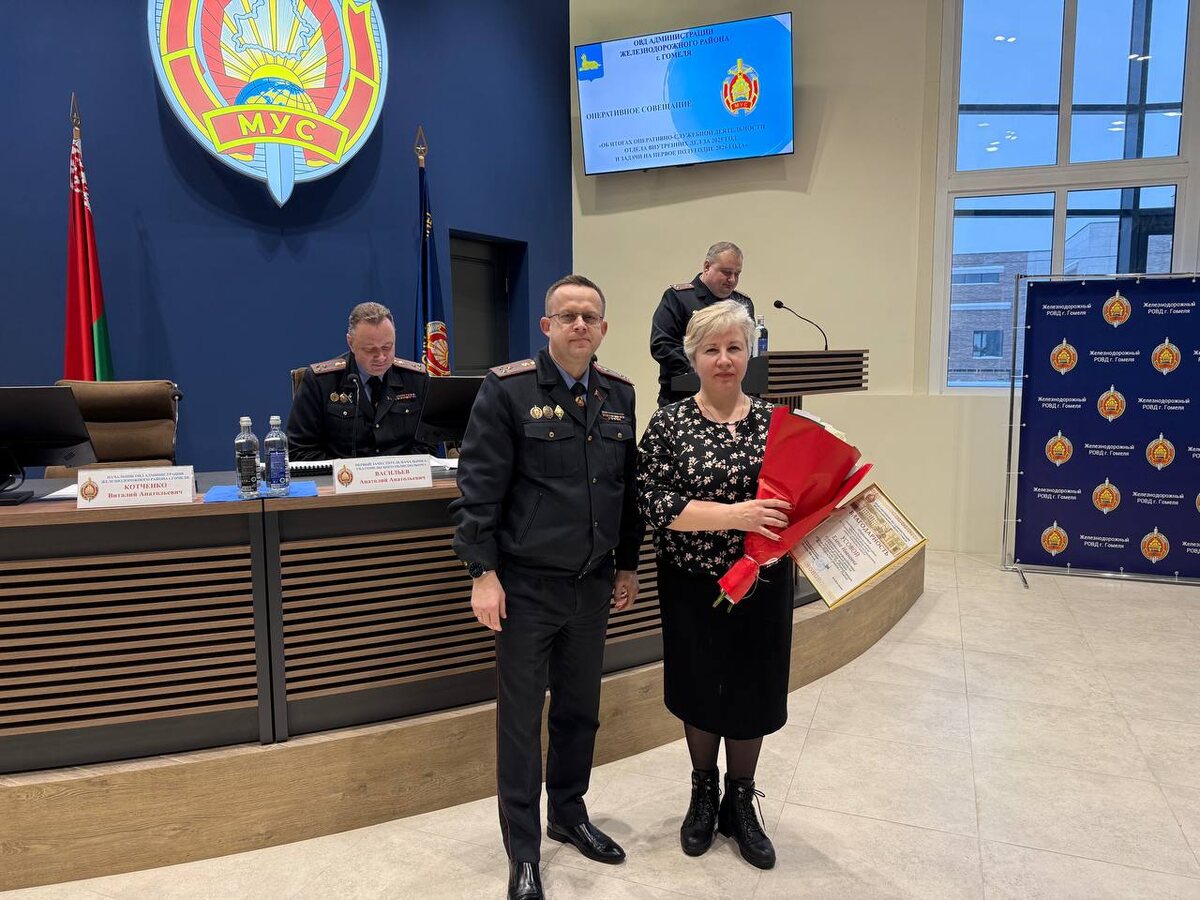 ✅ 8 января в Железнодорожном отделе внутренних дел перед началом оперативного совещания «Об итогах оперативно-служебной деятельности отдела внутренних дел за 2025 год и задачах на первое полугодие 2026 года» в торжественной обстановке в присутствии личного состава подразделения состоялось награждение. 🤝 За эффективное взаимодействие с отделом уголовного розыска криминальной милиции отдела внутренних дел администрации Железнодорожного района г. Гомеля были вручены благодарности заместителю декана по учебной работе юридического факультета УО «Гомельский государственный университет имени Франциска Скорины» Елене Усовой и заведующему лабораторией кафедры уголовного права и процесса Елене Степаненко. 🖇 Награждение провел начальник отдела, полковник милиции Виталий Котченко.
