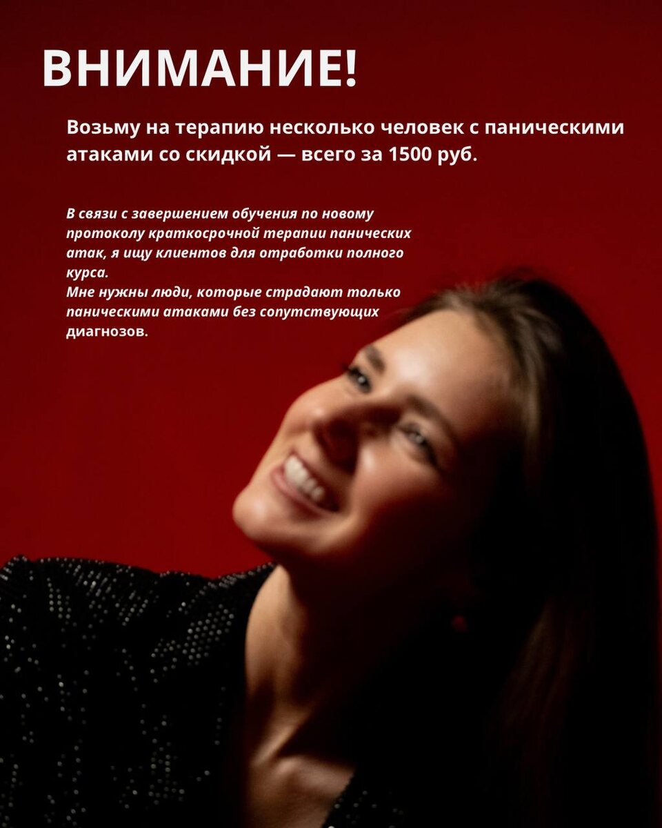 ! Возьму на терапию несколько человек с паническими атаками со скидкой — всего за 1500 руб. В связи с окончанием обучения по новому протоколу краткосрочной терапии панических атак, я ищу клиентов для отработки полного курса. Мне нужны люди, которые страдают только паническими атаками без сопутствующих диагнозов. Что такое паническая атака? Это внезапный приступ сильного страха или дискомфорта, который достигает пика за несколько минут и сопровождается физическими и психическими симптомами: Вегетативные симптомы: • Усиленное или учащенное сердцебиение (тахикардия, пульсация) • Потливость • Дрожание, тремор (в том числе внутренний) • Сухость во рту Симптомы, относящиеся к телу: • Затруднения в дыхании • Чувство удушья • Боли или дискомфорт в груди • Тошнота или дискомфорт в животе (жжение, диарея, метеоризм) Симптомы, относящиеся к психическому состоянию: • Чувство головокружения, неустойчивости, обморочности • Ощущение нереальности происходящего (дереализация) или отдалённости от соб