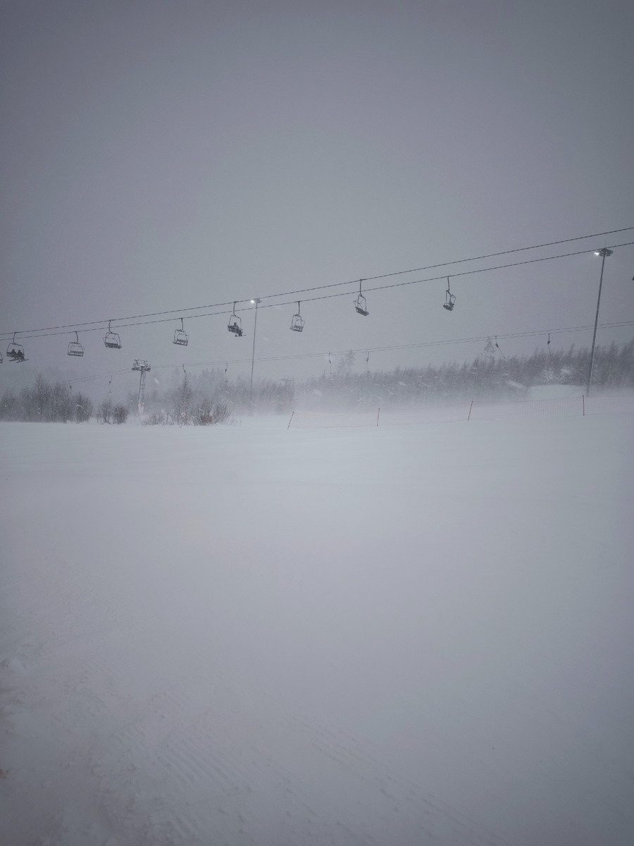 Приезжаем к открытию на Игору, а там тишина и метель. Кассы не работают, непонятно, запустят ли подъёмники. Видимость сквозь снежную пелену максимум метров двадцать, не больше. Но нам же хочется кататься! И, кажется, администрация это поняла, что народ то все равно приехал и кассы открылись, сказали загадочное «будем работать по ситуации», но включили все подъёмники, даже кресельные.