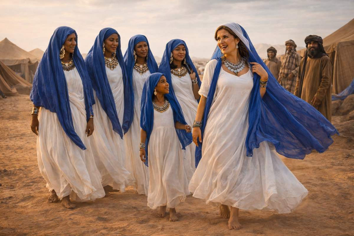 Рафаэль, и следом за ним Надежда, вышли на открытое пространство. И тут же, словно из самого воздуха, возникла небольшая стайка женщин в белоснежных, струящихся платьях. Их головы и плечи были укутаны синими платками, но лица оставались открытыми – смуглыми, строгими и удивительно красивыми, оттенёнными тяжёлыми золотыми украшениями в ушах и на шее. Мягко, но настойчиво они окружили Надежду, склонив головы в почтительном, но не рабском поклоне, и жестами, лёгкими движениями полусогнутых рук стали указывать путь, уводя её вглубь лагеря.