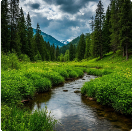 На изображении представлена живописная природа с рекой, которая извивается через зелёные луга. По обеим сторонам реки растут густые кустарники и высокая трава, создавая ощущение зелёного ковра. Вдоль берегов реки растут высокие хвойные деревья, их тёмно-зелёные ветви тянутся к небу. Вдали виднеются величественные горы, покрытые снегом, что создаёт контраст с зеленью на переднем плане. Небо над горами покрыто облаками, которые придают сцене драматичность и глубину. Вода в реке чистая и прозрачная, с небольшими камнями на дне. Вся сцена наполнена спокойствием и умиротворением, создавая атмосферу уединения и гармонии с природой.
