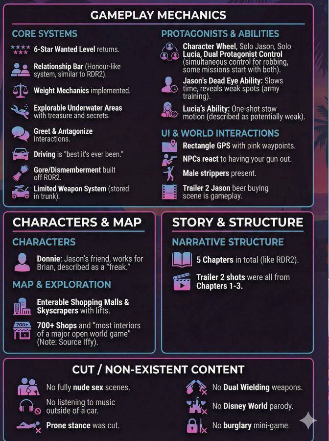 Самое важное: 📌Более 700 магазинов: ТЦ и небоскрёбы с работающими лифтами 📌Система набора и потери веса 📌Возвращение 6 звёзд розыска 📌Джейсон и Люсия имеют динамическую механику отношений 📌Vice City — самый масштабный город в истории Rockstar 📌Плавное переключение между героями, когда они рядом 📌NPC по-разному реагируют на оружие в руках 📌Подводное исследование с секретами и скрытыми зонами 📌Самая проработанная система вождения за всю серию 📌Продвинутый ИИ полиции 📌Динамическая погода, включая штормы ⚡Наш канал⚡