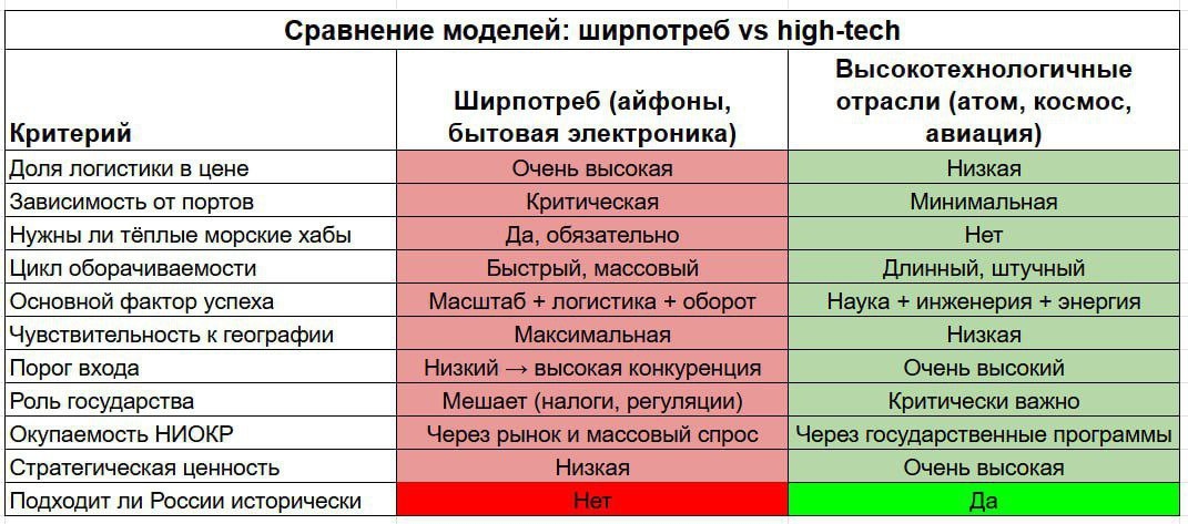 Почему Россия обречена проигрывать в ширпотребе * Нет удобных портов в центре экономики * Длинное логистическое плечо * Холодный климат → дорогая инфраструктура * Низкая маржа → логистика «съедает» всё Даже идеальное управление не меняет географию. Почему Россия естественно сильна в high-tech? Чем выше доля науки и энергии в цене продукта и ниже доля доставки, тем сильнее Россия. Конкретно: * Атомная энергетика * Космос * Авиация * ВПК Вопросы? 😏 Брекотин. Подписаться 🇷🇺 Брекотин в MAX