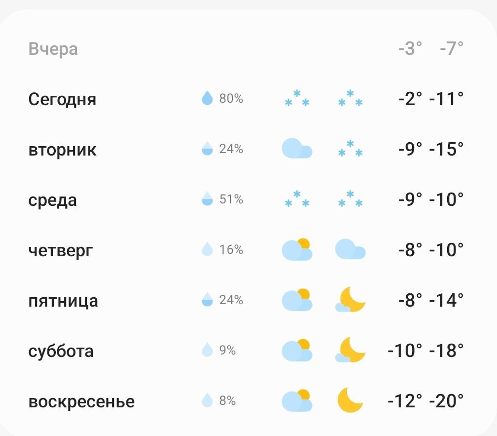 До четверга будет идти снег, а к воскресенью начнутся ночные заморозки до - 20°С.