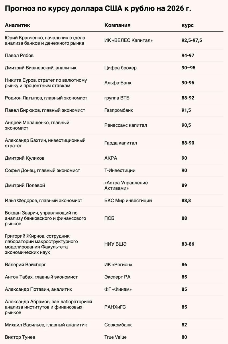Среднегодовой курс доллара составит около 88,5 руб./$ — консенсус-прогноз Ведомостей. Основным драйвером разворота курса аналитики называют снижение ключевой ставки. Дополнительное давление на рубль окажут цены на нефть. Ещё один важный фактор — сокращение продаж валюты со стороны государства. Эксперты не ждут резкой девальвации. Большинство прогнозов предполагает плавное ослабление рубля, особенно во второй половине года.