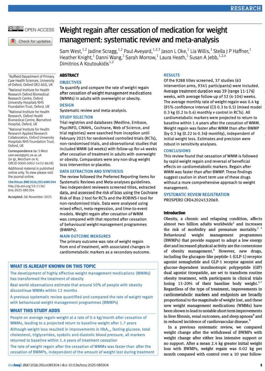 ? Систематический обзор и метаанализ из BMJ 2026 года дает нам одну из самых ясных оценок в отношении восстановления веса после прекращения приема препаратов для контроля веса (ПКВ), включая препараты, влияющие на GLP-1 и двойную инкретиновую терапию. 📉 Главный вывод В среднем люди возвращают ~0,4 кг в месяц после прекращения приема ПКВ. При таких темпах исходный вес возвращается примерно через 1,7 года. Для новых, высокоэффективных инкретиновых препаратов (например, семаглутид, тирзепатид) набор веса происходит еще быстрее — до 0,8 кг/месяц, с возвращением к исходному уровню примерно через 1,5 года. 🫀 Метаболические преимущества тоже исчезают Улучшения показателей HbA1c (гликированный гемоглобин), уровня глюкозы натощак, липидов и артериального давления тесно коррелируют с весом. После прекращения приема лекарств, все эти кардиометаболические показатели неуклонно ухудшаются, возвращаясь к исходному уровню примерно через 1,4 года. Снижение веса без поддержания результата = временн