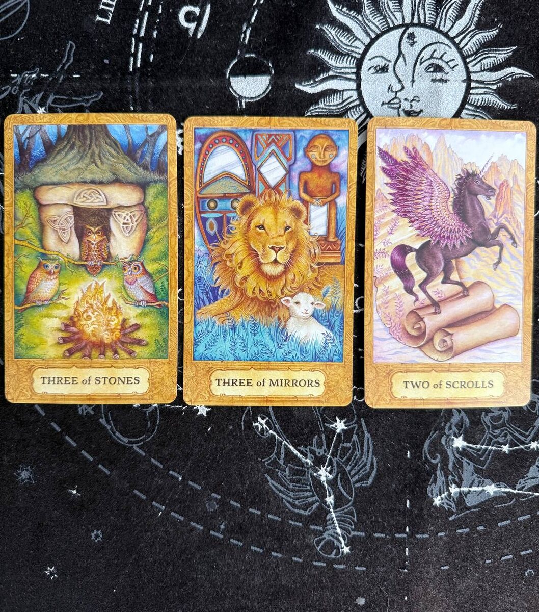 Эта неделя начинается с ощущения опоры и внутреннего круга. Three of Stones говорит о месте силы — о доме, о людях, рядом с которыми можно быть собой. Неделя хорошо подходит для встреч, разговоров по душам, восстановления энергии, возвращения к тому, что когда-то согревало. Не спешите — сейчас важно чувствовать почву под ногами. В центре расклада — Three of Mirrors. Это карта честного взгляда на себя. На этой неделе может прийти понимание, кем вы стали и что в вас выросло. Возможно, вы увидите свои сильные стороны яснее, чем раньше, или получите подтверждение своей ценности через другого человека. Хорошее время для принятия себя, без критики и сравнений. Завершает расклад Two of Scrolls. Она говорит о выборе и движении вперёд. Информация, идея или предложение могут подтолкнуть к решению, которое давно созревало. Это не резкий шаг, а осознанный поворот — когда вы уже знаете, куда и зачем идёте. Совет недели: берегите свой внутренний огонь, слушайте себя и не бойтесь делать выбор, кот