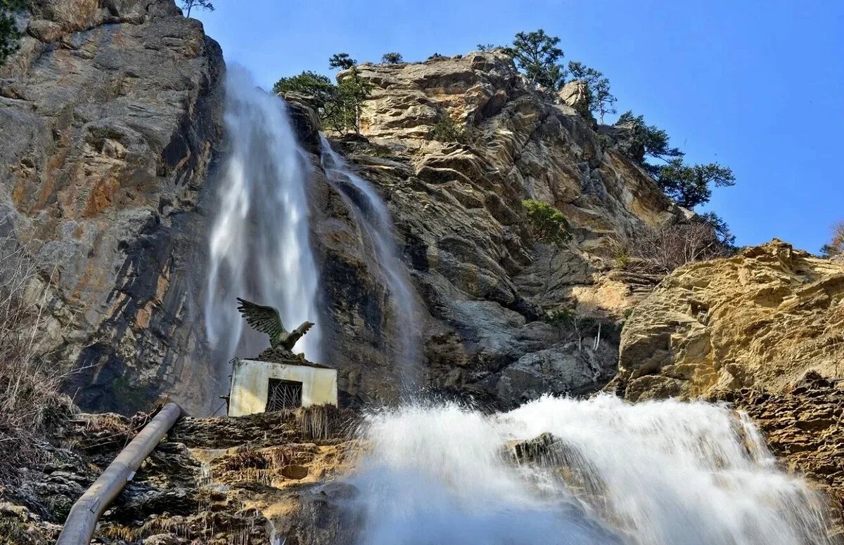 На карте Крыма есть места, в судьбе которых сплелись природа, история и человеческая боль. Одно из таких мест - водопад Учан-Су, жемчужина ЮБК и самый высокий водопад Крыма (по новым данным 115м) Его название, которое переводится с крымскотатарского как "летящая вода", как нельзя лучше описывает мощный поток, низвергающийся со скалы. Для одних это вечный символ природной красоты и легенд, для других - вечное напоминание о страшных событиях Гражданской войны, когда здесь, в укромных урочищах, разворачивалась одна из самых мрачных страниц ялтинской истории. от легенд до водопровода Учан-Су существует уже много тысячелетий, и древние греки, жившие в Крыму, называли его Кремасто-Неро - "висящая вода". На протяжении XX века практическая польза от водопада уравновесила его поэтический образ. На втором каскаде Учан-Су стоит небольшое строение с узнаваемой скульптурой орла на крыше. Это - водозаборная станция, откуда вода по трубам поступает в Могабинское водохранилище и обеспечивает водоснаб