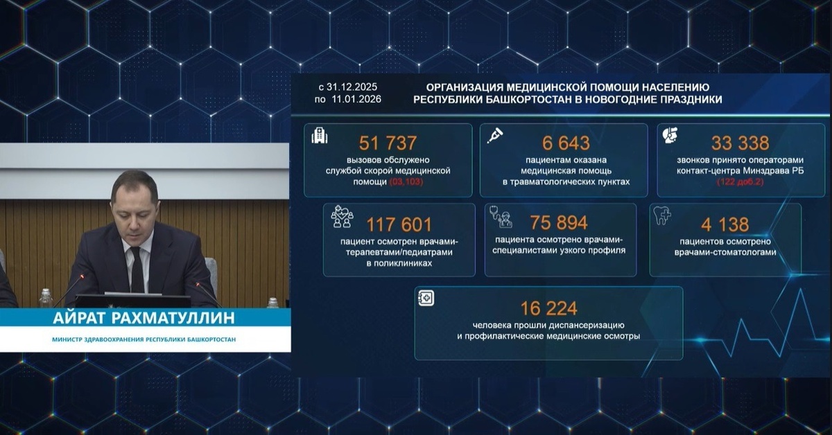 Жители Башкирии с 31 декабря 2025 года по 11 января 2026 года получили всю необходимую квалифицированную медпомощь, сообщил министр здравоохранения республики Айрат Рахматуллин на первом в этом году оперативном совещании правительства в ЦУРе. Амбулаторное лечение людей было организовано со 2 января. По словам Айрата Рахматуллина, за это время более 6 тысяч жителей обратились в травмпункты, более 51 тысячи вызвали скорую медпомощь. В поликлиниках врачи осмотрели более 117 тысяч пациентов, в том числе свыше 75 тысяч — специалисты узкого профиля и более 4 тысяч — стоматологи. Кроме того, более 16 тысяч пациентов прошли диспансеризацию и медосмотры. «Система сработала нормально», — отметил глава минздрава.
