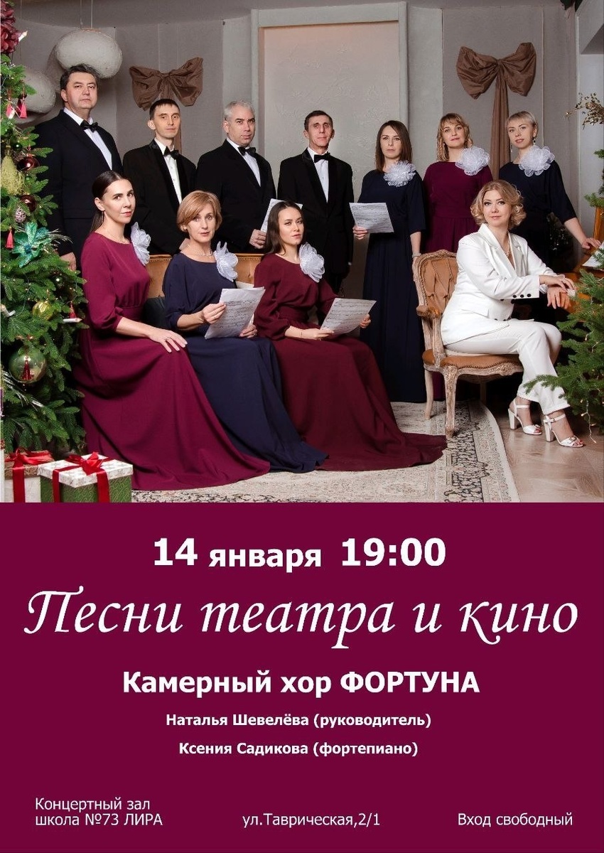 "ПЕСНИ ТЕАТРА И КИНО" 🌟Когда: 14 января, 19.00 🌟 Где: Концертный зал Школы "ЛИРА", ул.Таврическая д.2/1 🌟 Вход свободный 🎶Камерный хор "Фортуна" приглашает окунуться в мир музыки и искусства! Программа вечера включает лучшие произведения, ставшие неотъемлемой частью культуры нашего времени. Вас ждут незабываемые мелодии из известных оперетт и популярных кинофильмов. Это событие станет прекрасным поводом провести вечер в приятной атмосфере вместе с друзьями и близкими людьми. 🌟Приглашаем встретить Старый Новый год с прекрасной музыкой, пусть она подарит Вам вдохновение и радость! #14_январь_2026@afisha_kto