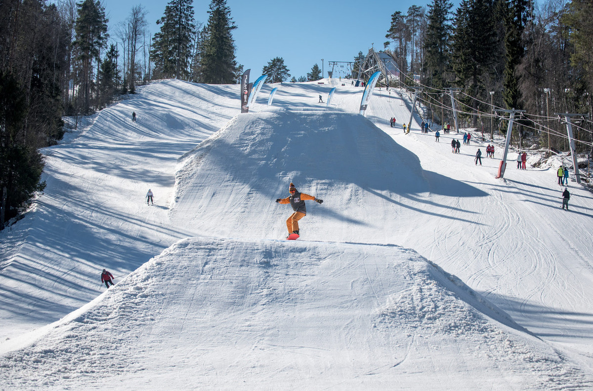 - Склон №3. Сноубордический парк FUN PARK — старейший в Санкт-Петербурге. Здесь есть 5 линий, более 10 фигур, трамплины разной высоты и сложности. Подходит как для новичков, так и для профессионалов.
