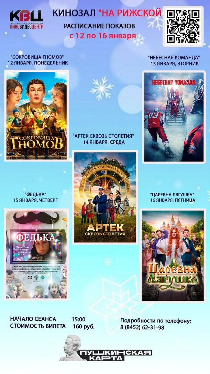 π₯ ΠΠΈΠ½ΠΎΠ·Π°Π» Β«ΠΠ° Π ΠΈΠΆΡΠΊΠΎΠΉ" - Π·ΠΈΠΌΠ½Π΅Π΅ ΡΠ°ΡΠΏΠΈΡΠ°Π½ΠΈΠ΅ Ρ 12 ΠΏΠΎ 16 ΡΠ½Π²Π°ΡΡ! π ΠΠ°ΡΠ°Π»ΠΎ Π² 15.00. π Π‘ΡΠΎΠΈΠΌΠΎΡΡΡ Π±ΠΈΠ»Π΅ΡΠ° 160 ΡΡΠ±Π»Π΅ΠΉ. π ΠΠΎΠ΄ΡΠΎΠ±Π½ΠΎΡΡΠΈ ΠΏΠΎ ΡΠ΅Π»Π΅ΡΠΎΠ½Π°ΠΌ: (8452) 62-31-98, (8452) 62-02-10