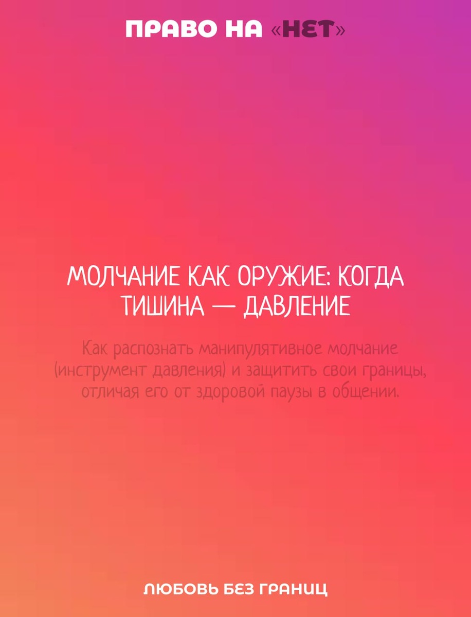 Молчание не всегда — знак задумчивости или желания взять паузу. Иногда это осознанный инструмент манипуляции, призванный: — вызвать у вас чувство вины; — заставить гадать, «что пошло не так»; — подавить вашу инициативу; — добиться покорности без открытого конфликта. Как распознать токсичное молчание Обратите внимание на эти маркеры: — Избирательность. Вас «отключают» только тогда, когда вы выражаете несогласие или сильные эмоции. — Наказание молчанием. После конфликта общение прерывается на долгое время — пока вы не извинитесь первым. — Газлайтинг в дополнение. Фразы вроде «Ты всё выдумал» или «Не драматизируй» обесценивают ваши переживания и усиливают чувство вины. Почему это работает Манипулятор использует молчание, потому что: — боится потерять контроль; — не умеет открыто обсуждать проблемы; — стремится избежать ответственности. Вы можете поддаваться на эту тактику из‑за: — страха одиночества; — ощущения собственной вины; — детских паттернов (если в семье молчание было способом