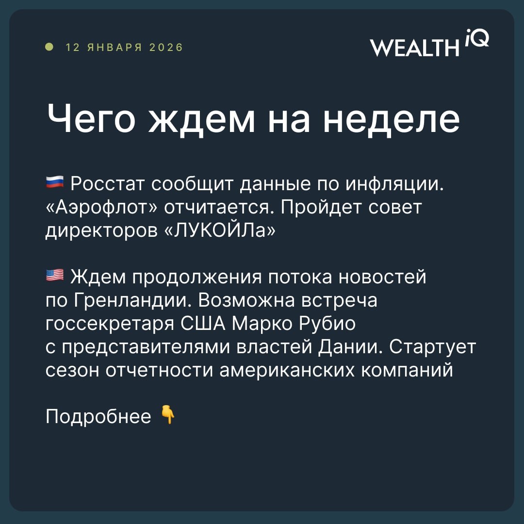 🇷🇺Россия: фокус на инфляции На неделе Росстат сообщит данные по инфляции: в среду — за период с 1 по 12 января, в пятницу – за декабрь 2025-го. Во вторник совет директоров «ЛУКОЙЛа» рассмотрит вопрос о предварительных итогах деятельности компании за 2025 год и задачах на 2026-й. «Аэрофлот» в пятницу представит операционные результаты за декабрь прошлого года. 🇺🇸США: обсуждение будущего Гренландии и старт сезона отчетности На неделе ждем продолжения потока новостей, касающихся Гренландии. Возможна встреча госсекретаря США Марко Рубио с представителями властей Дании по этому вопросу. Сезон отчетности за четвертый квартал в США, как обычно, начинается с банков. Инвесторы настроены позитивно, учитывая прошедшую волну поглощений и высокую торговую активность на фондовых рынках. Количество макроданных будет скромным, ключевые релизы — данные по инфляции в США во вторник и среду. #НеделяНачинается 🏦 @wealth_iqs